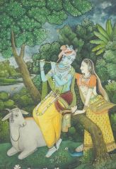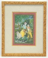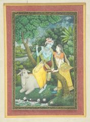 South Asian Miniature Painting, 5 7/8 x 3 7/8", "Shiva, Parvati & Nandi The Bull".