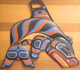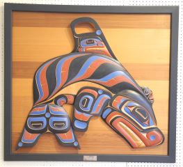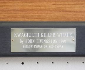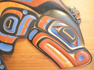 Yellow Cedar on Red Cedar Plaque by John Livingston 1991, 47 3/4 x 52 1/2", "Kwagiulth Killer