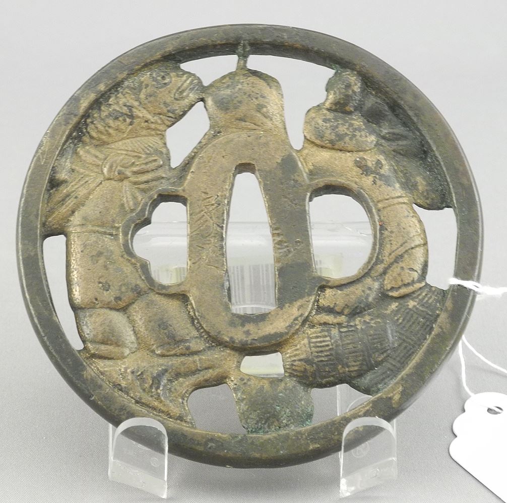 LOT 193 Japanese Copper Alloy "Ebisu" Tsuba, signed, 3 1/8"h, 157g. Estimate: $250 - $400 Sold For: $300 Auction Date: Tuesday, October 21 2025 at 4:00 PM