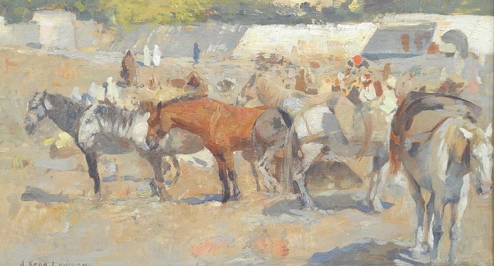 Oil on Board signed J.(James) Kerr- Lawson, 9 1/2 x 16 1/2", "A Gathering of Horses".