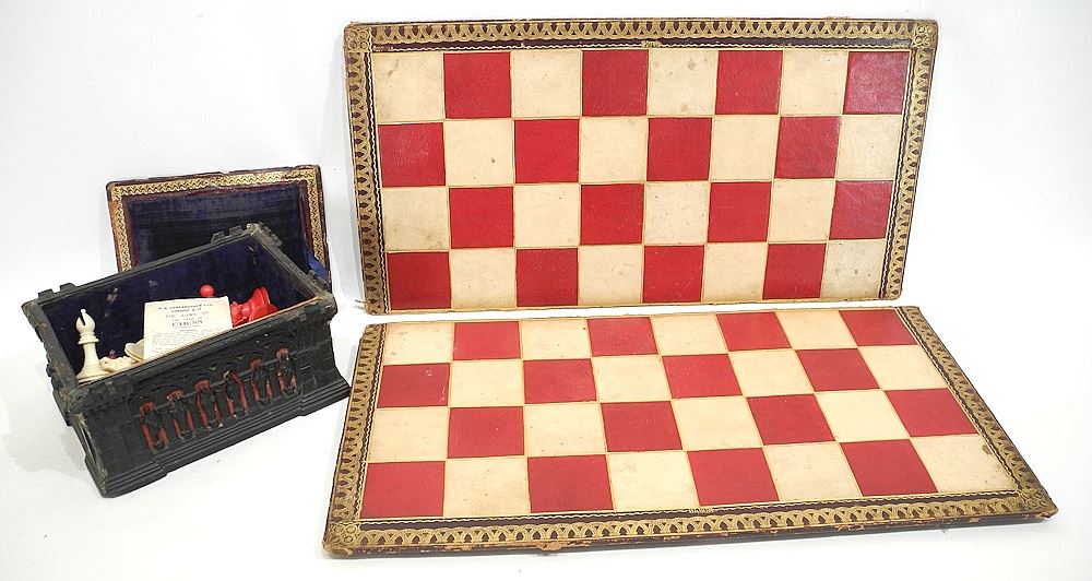 LOT 169 Jaques London "The Staunton Chess- Men" Original Board, 20 1/2"w (as found), NO EXPORT. Estimate: $500 - $1,000 Sold For: $1,800 Auction Date: Tuesday, October 21 2025 at 4:00 PM