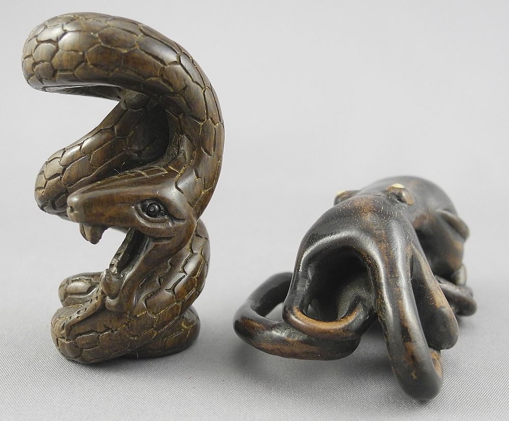 Two Japanese Wood Netsuke: Octopus (2 1/2"L) & Coiled Snake, 2 1/8"h, NO EXPORT.