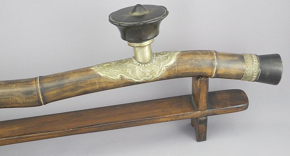 LOT 98 Bamboo Opium Pipe with Brass Carvings, Black Bone End, 19 5/8"L. Estimate: $250 - $350 Sold For: $250 Auction Date: Tuesday, October 21 2025 at 4:00 PM