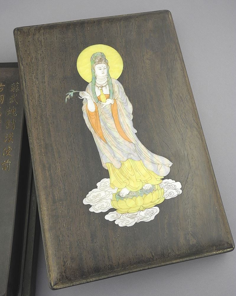 LOT 132 Purple Duan Inkstone in Inlaid Pterocarpus Santolinus Box, 2 x 6 5/8 x 10". Estimate: $400 - $500 Auction Date: Tuesday, October 21 2025 at 4:00 PM