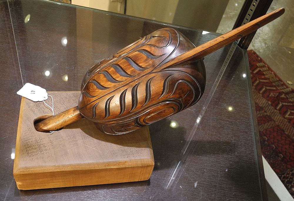 Kwagiulth Rattle signed L.(Lloyd) Wadhams (15 1/2"L) with Stand.