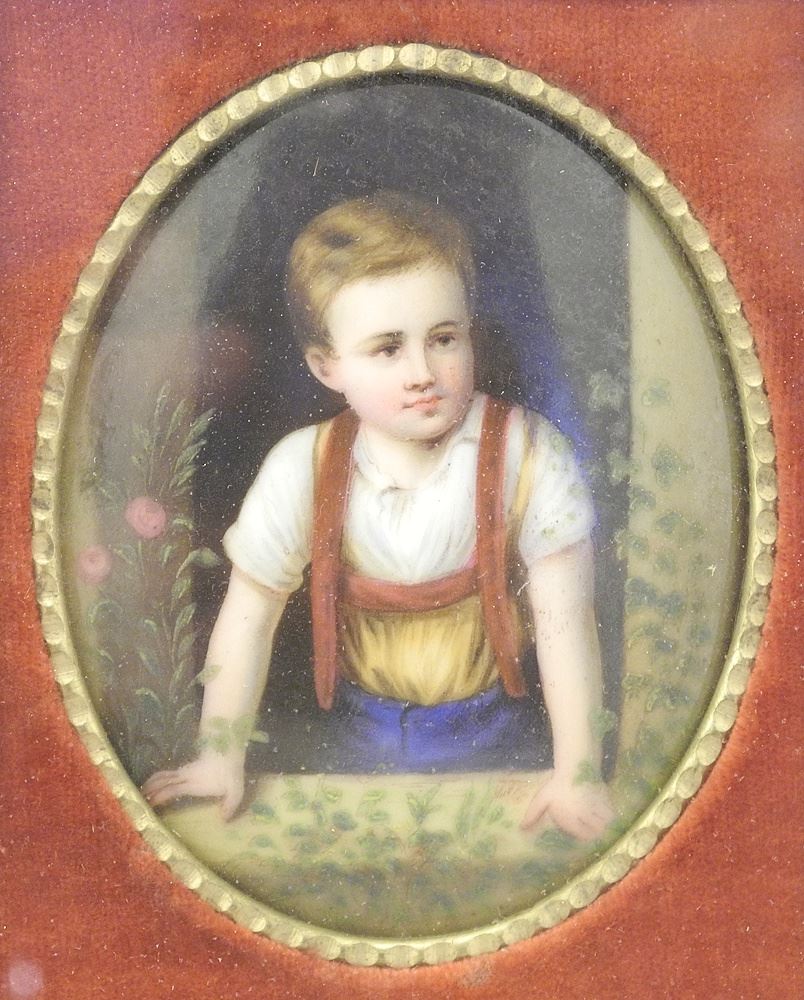 Pair of Portrait Miniatures on Porcelain in Brass Frames, "Two Boys ", 3 1/4 x 2 1/2" Oval.