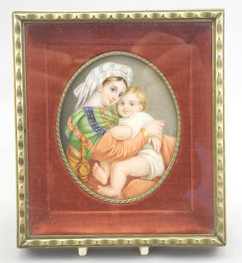 Portrait Miniature on Porcelain After Raphael, 4 x 3" Oval, "Madonna & Child".