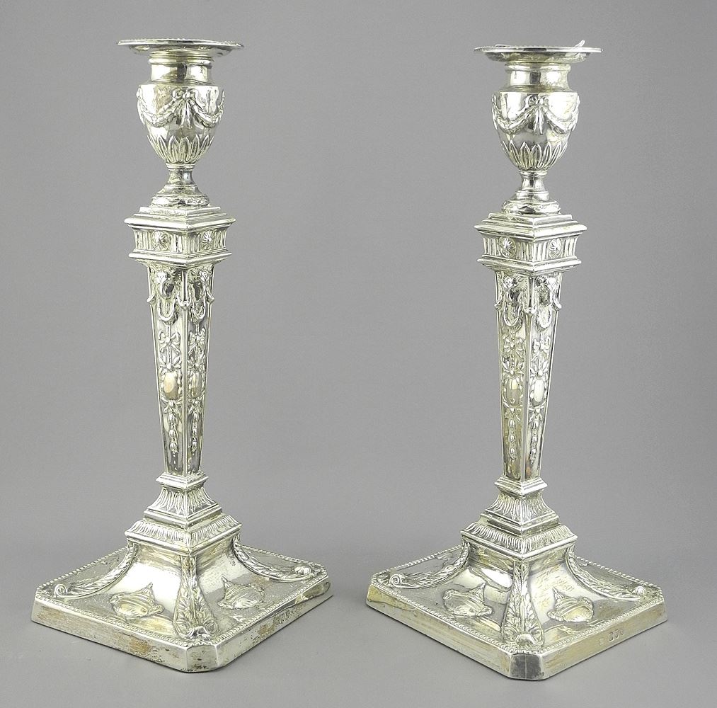 LOT 105 Pair of Silver Adam Style Candlesticks: EH (Edward Hutton), London, 2460g. Estimate: $1,750 - $2,250 Auction Date: Tuesday, October 21 2025 at 4:00 PM