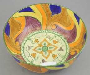 LOT 49 Unmarked Clarice Cliff Persian Pattern Large Bowl, Circa 1929, 8 1/ 4". Estimate: $200 - $400 Sold For: $200 Auction Date: Tuesday, December 09 2025 at 4:00 PM