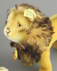 LOT 106 Two Steiff "Leo" Lions, 12 & 7"L (larger lacking button). Estimate: $100 - $200 Auction Date: Tuesday, December 09 2025 at 4:00 PM