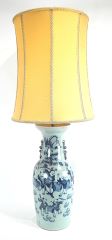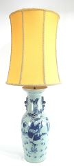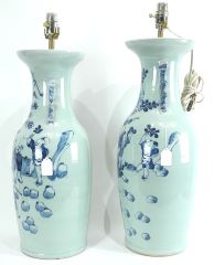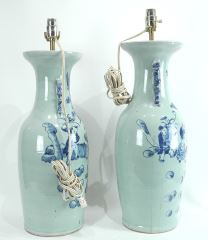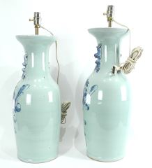 Near Pair of Chinese Pak Celadon Molded Blue & White Vases Mounted as Lamps.