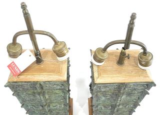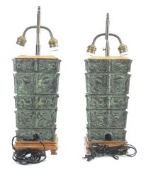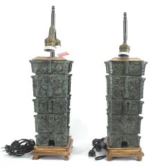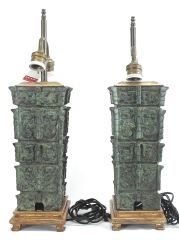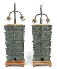 Pair of Chinese Verdigris Bronze Archaic Style Table Lamps, 12"h.