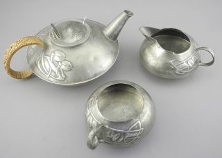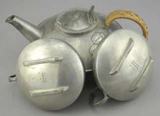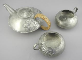 LOT 60 Liberty & Co. Archibald Knox Design Three Piece Tea Set, Model 0231, Pot 9 5/8"L. Estimate: $300 - $500 Sold For: $325 Auction Date: Tuesday, December 09 2025 at 4:00 PM